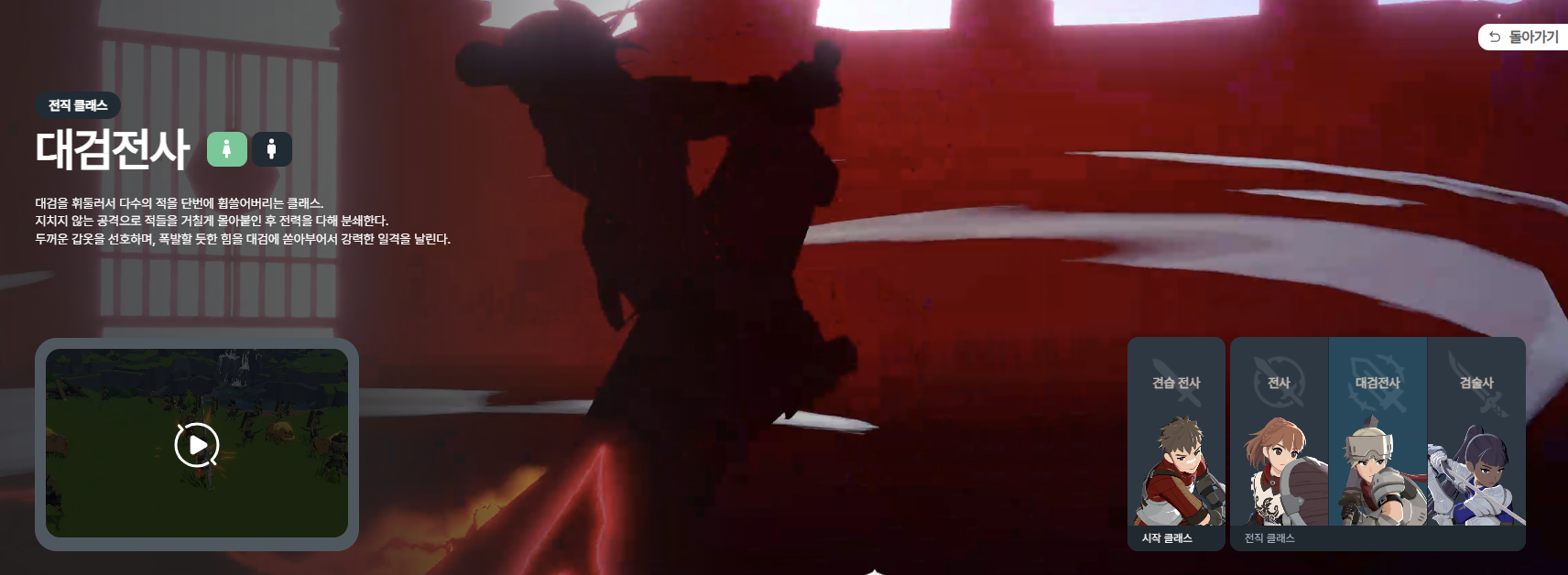 - 대검전사: 느리지만 강한 한 방. 묵직한 타격감을 원하는 유저에게 적합.
