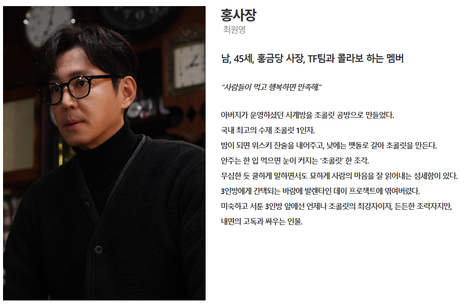 아버지가 운영하던 시계방을 초콜릿 공방으로 바꿔 운영 중입니다. 우연히 주슬기를 만나 초콜릿 TF팀과 협업하며 발렌타인 프로젝트를 돕게 됩니다. 팀의 부족한 점을 보완해주는 조력자이자 든든한 멘토 역할을 합니다.