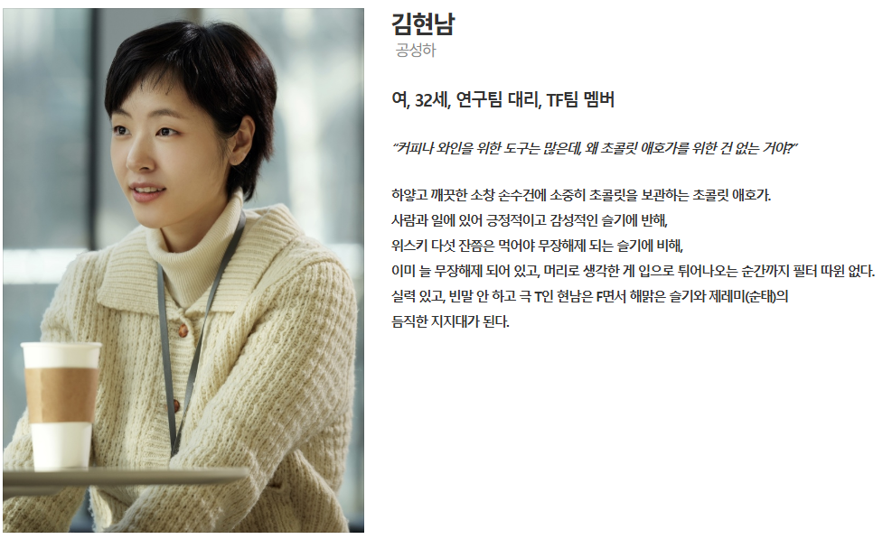 초콜릿 회사에서 ‘달콤한 제레미’ 계정을 운영하며, 유쾌하고 센스 있는 분위기로 TF팀의 웃음을 책임집니다. 해맑은 성격으로 주슬기와 김현남 사이에서 중재 역할을 하며 팀워크를 이끕니다.