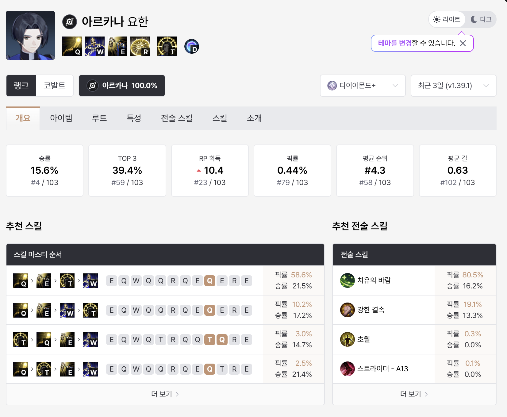 이터널 리턴 닥지지는 이터널 리턴 전적 검색뿐만 아니라 다양한 랭킹 정보를 제공합니다. 특정 캐릭터별 랭킹, 무기 사용률, 최고 승률 조합 등을 제공하여 플레이어들이 보다 효율적인 전략을 세울 수 있도록 도와줍니다. 랭킹을 통해 자신의 위치를 파악하고, 상위권 플레이어들의 빌드를 참고하여 실력을 향상시킬 수 있습니다. 닥지지 이터널 리턴을 활용하면 더욱 체계적인 게임 플레이가 가능합니다.